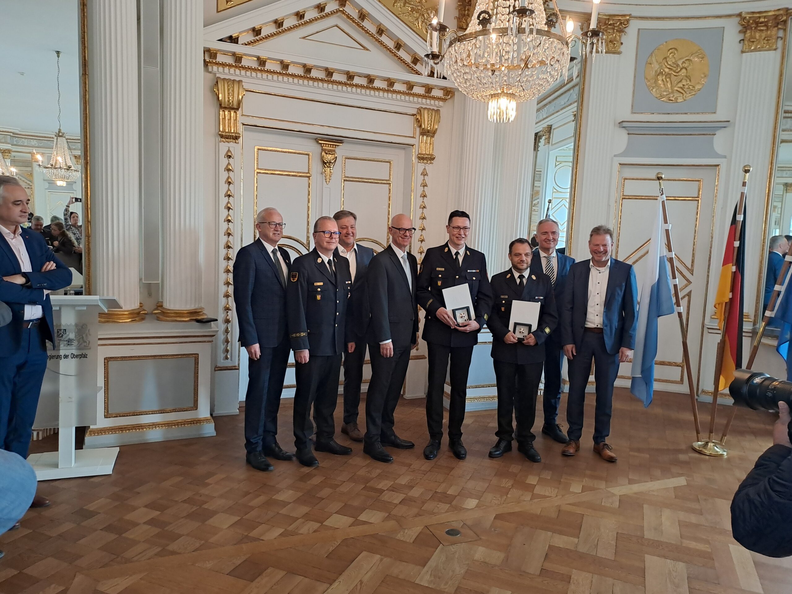 Regierungspräsident Walter Jonas hat im Auftrag von Staatsminister Joachim Herrmann das Steckkreuz für besondere Verdienste um das Feuerwehrwesen an acht verdiente Oberpfälzer ausgehändigt.